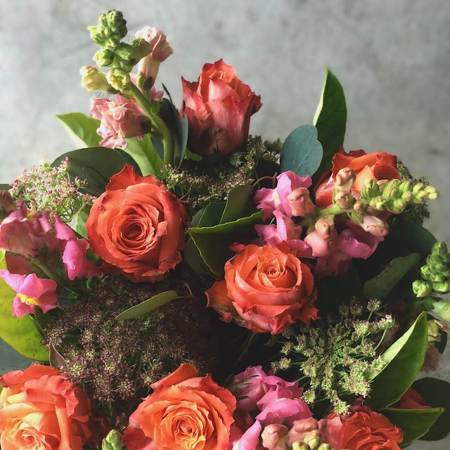 Hand-tied Rose bouquet wrapped and ribboned. Cherry brandy roses. Gerberas crysanthenums and an assortment of foliage.