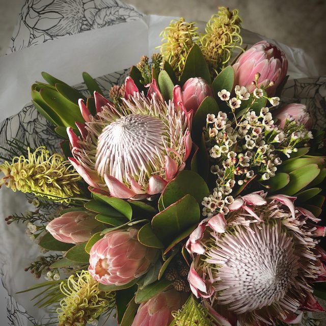Best of local Cape Fynbos including King Proteas. Wrapped and ribboned.